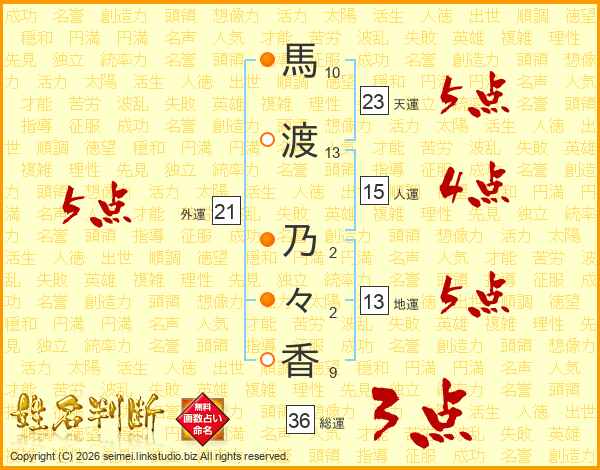 馬(10画)渡(13画) 乃(2画)々(2画)香(9画)