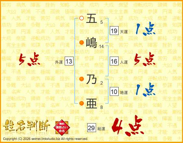 五(5画)嶋(14画) 乃(2画)亜(8画)