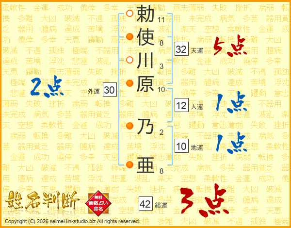 勅(11画)使(8画)川(3画)原(10画) 乃(2画)亜(8画)