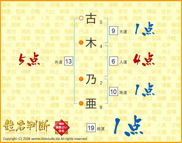 古(5画)木(4画) 乃(2画)亜(8画)