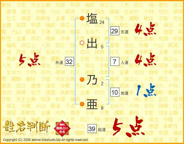 塩(24画)出(5画) 乃(2画)亜(8画)