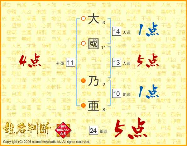 生活面を象徴する運勢です。外部から受ける影響力を表し、結婚運、家庭運や職場、環境への順応性を表します。総運から人運を引いた画数。姓や名が1文字の場合を除く。