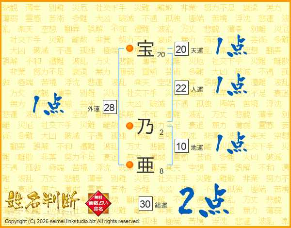 宝(20画) 乃(2画)亜(8画)