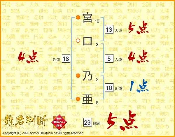 宮口乃亜さんの総運は23画の5点!