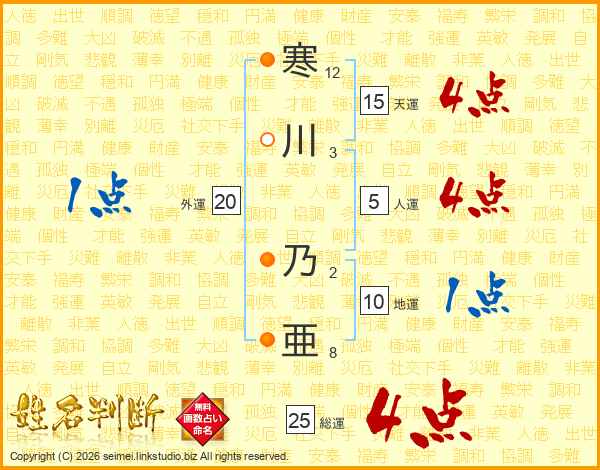 寒(12画)川(3画) 乃(2画)亜(8画)