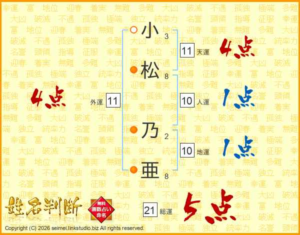 小松乃亜さんの総運は21画の5点!