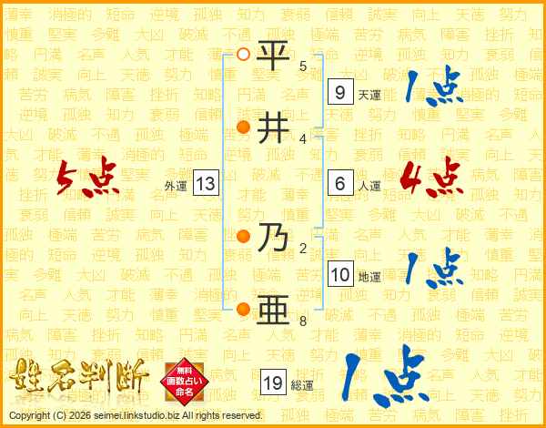 平(5画)井(4画) 乃(2画)亜(8画)