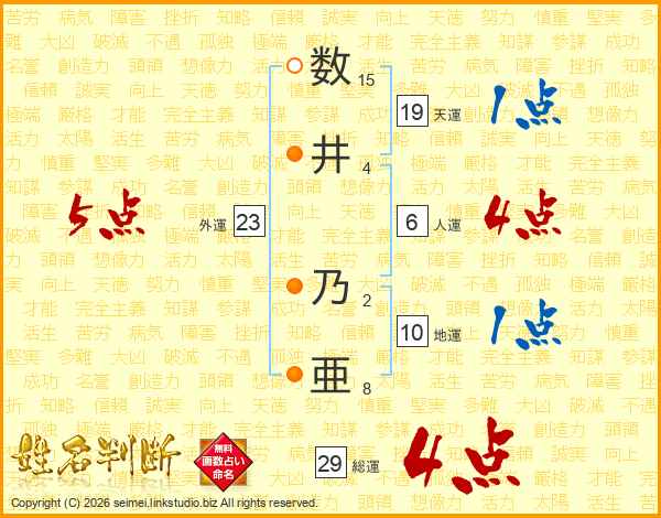 生活面を象徴する運勢です。外部から受ける影響力を表し、結婚運、家庭運や職場、環境への順応性を表します。総運から人運を引いた画数。姓や名が1文字の場合を除く。