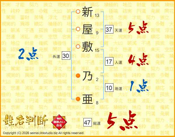 新(13画)屋(9画)敷(15画) 乃(2画)亜(8画)