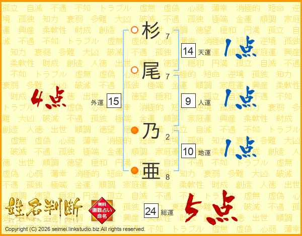 杉(7画)尾(7画) 乃(2画)亜(8画)