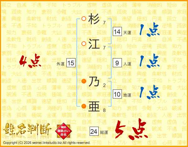 杉(7画)江(7画) 乃(2画)亜(8画)