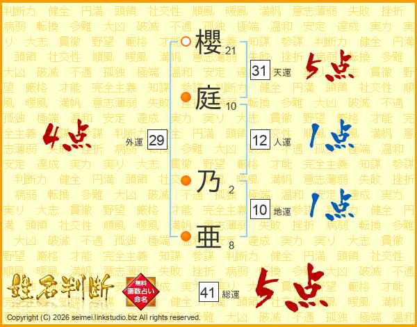 櫻(21画)庭(10画) 乃(2画)亜(8画)