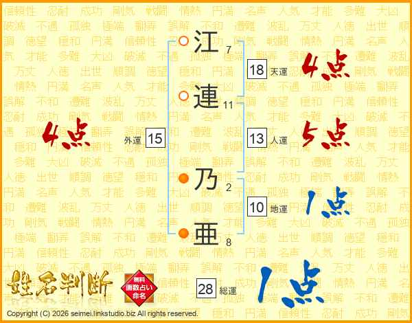 江(7画)連(11画) 乃(2画)亜(8画)