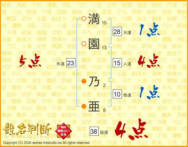 生活面を象徴する運勢です。外部から受ける影響力を表し、結婚運、家庭運や職場、環境への順応性を表します。総運から人運を引いた画数。姓や名が1文字の場合を除く。