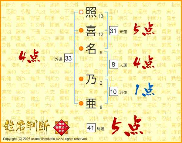 照(13画)喜(12画)名(6画) 乃(2画)亜(8画)