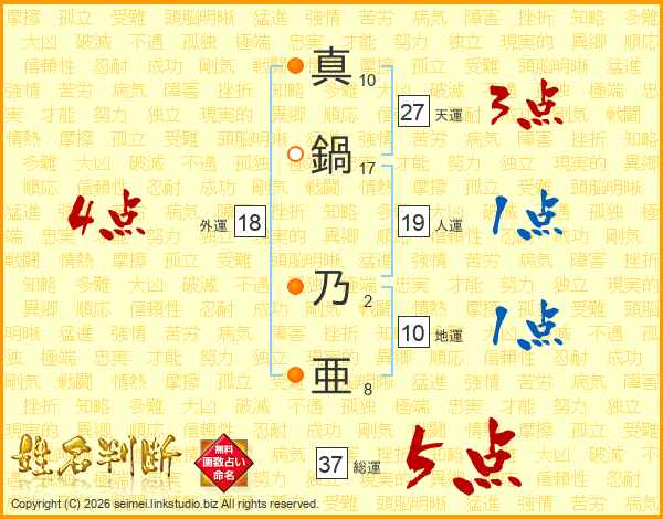 真鍋乃亜さんの総運は37画の5点!