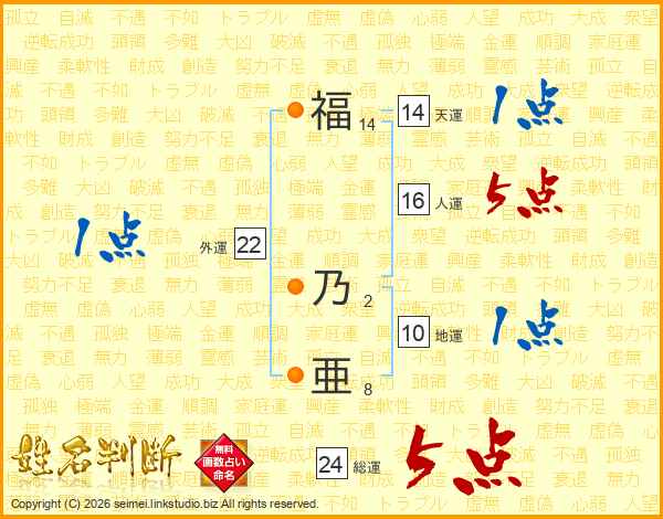福(14画) 乃(2画)亜(8画)