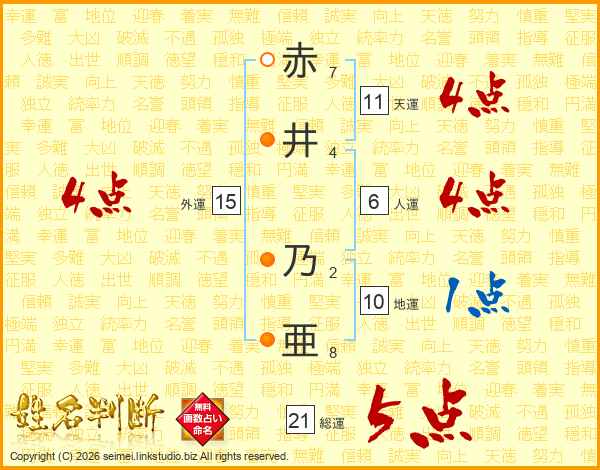 赤(7画)井(4画) 乃(2画)亜(8画)