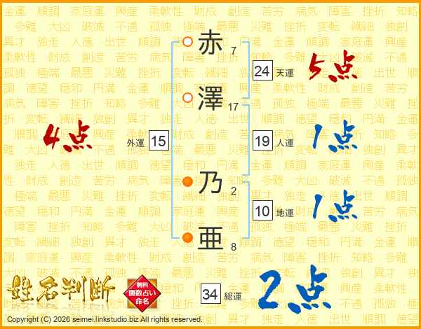 赤(7画)澤(17画) 乃(2画)亜(8画)