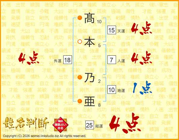 髙(10画)本(5画) 乃(2画)亜(8画)