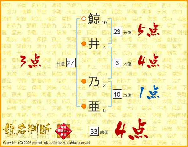 鯨(19画)井(4画) 乃(2画)亜(8画)