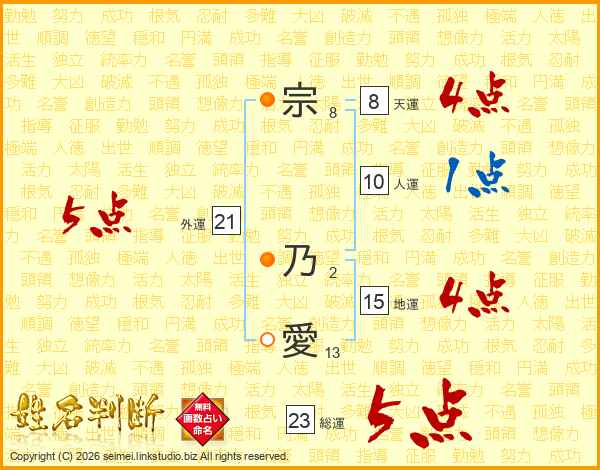 あなたの人生を表す1番重要な運勢です。生涯を通じて影響する総合運となり、主に50歳以降の晩年期に影響を及ぼします。苗字と名前の合計画数。
