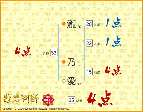 生活面を象徴する運勢です。外部から受ける影響力を表し、結婚運、家庭運や職場、環境への順応性を表します。総運から人運を引いた画数。姓や名が1文字の場合を除く。