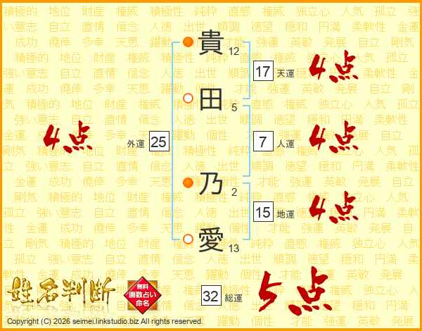 貴(12画)田(5画) 乃(2画)愛(13画)