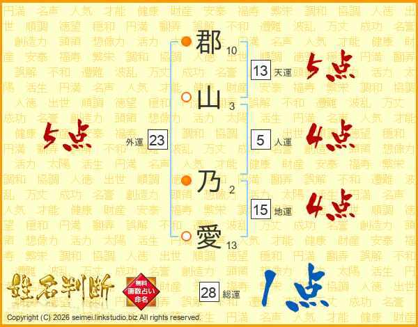 郡(10画)山(3画) 乃(2画)愛(13画)