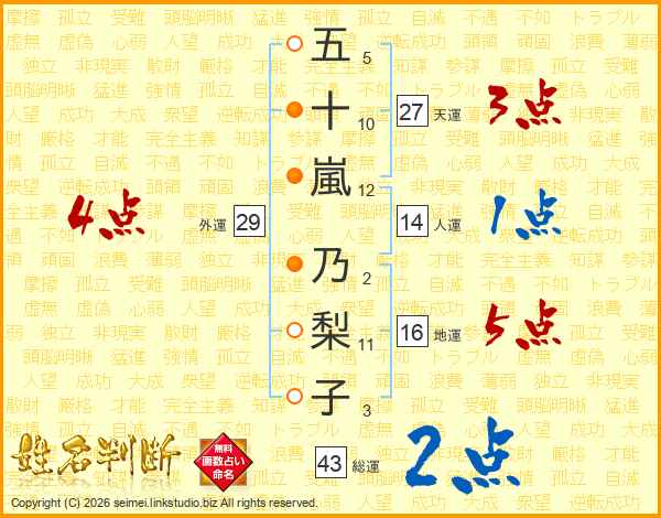 五(5画)十(10画)嵐(12画) 乃(2画)梨(11画)子(3画)