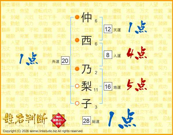 仲(6画)西(6画) 乃(2画)梨(11画)子(3画)