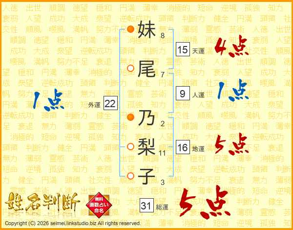 妹(8画)尾(7画) 乃(2画)梨(11画)子(3画)