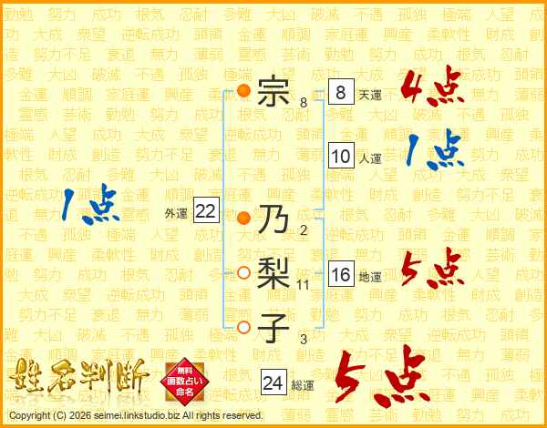 宗(8画) 乃(2画)梨(11画)子(3画)