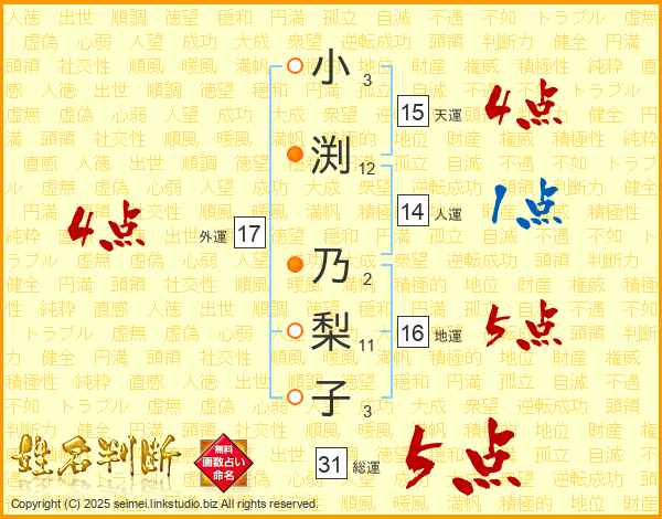 小(3画)渕(12画) 乃(2画)梨(11画)子(3画)