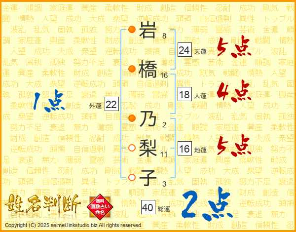 岩(8画)橋(16画) 乃(2画)梨(11画)子(3画)