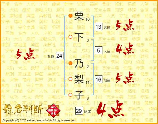 栗(10画)下(3画) 乃(2画)梨(11画)子(3画)