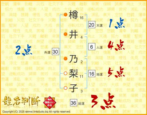 樽(16画)井(4画) 乃(2画)梨(11画)子(3画)
