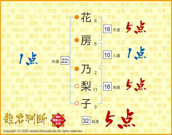 花(8画)房(8画) 乃(2画)梨(11画)子(3画)
