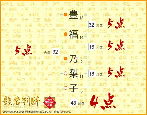 豊(18画)福(14画) 乃(2画)梨(11画)子(3画)