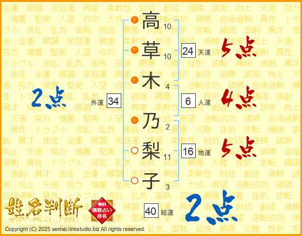 高(10画)草(10画)木(4画) 乃(2画)梨(11画)子(3画)