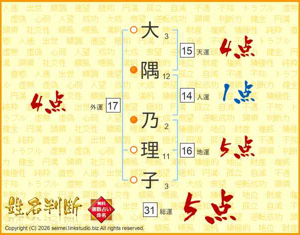 大(3画)隅(12画) 乃(2画)理(11画)子(3画)