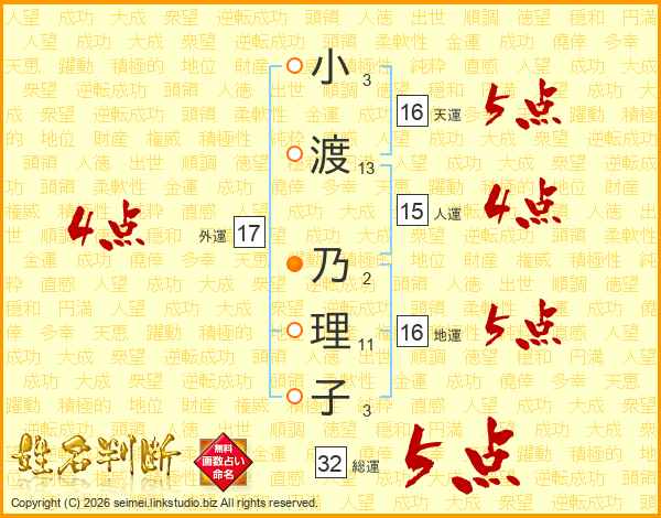 小渡乃理子さんの総運は32画の5点!