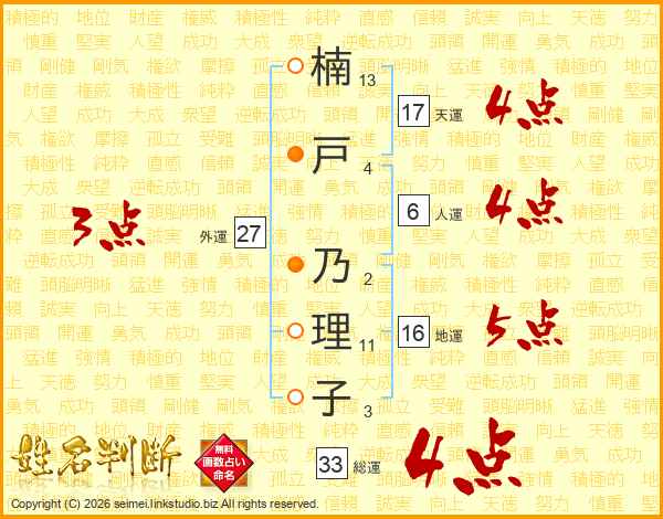 楠(13画)戸(4画) 乃(2画)理(11画)子(3画)