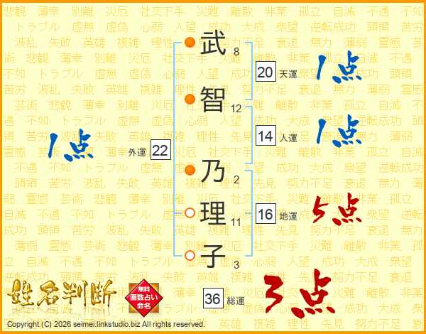 武(8画)智(12画) 乃(2画)理(11画)子(3画)