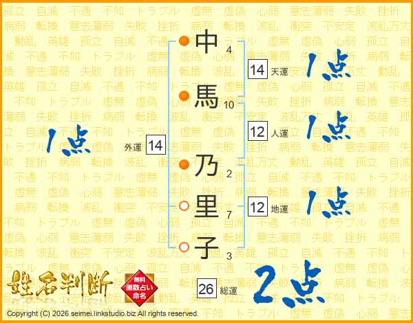 中馬乃里子さんの総運は26画の2点!