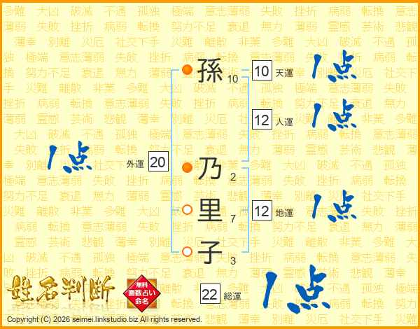 孫(10画) 乃(2画)里(7画)子(3画)