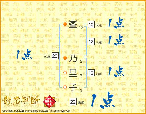 峯(10画) 乃(2画)里(7画)子(3画)