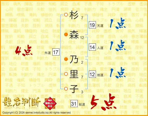 杉(7画)森(12画) 乃(2画)里(7画)子(3画)