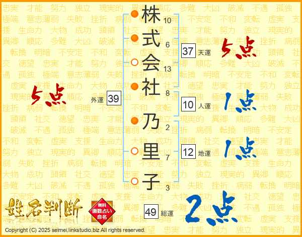 株式会社乃里子さんの総運は49画の2点!