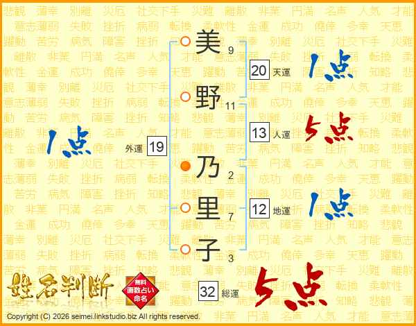 美(9画)野(11画) 乃(2画)里(7画)子(3画)